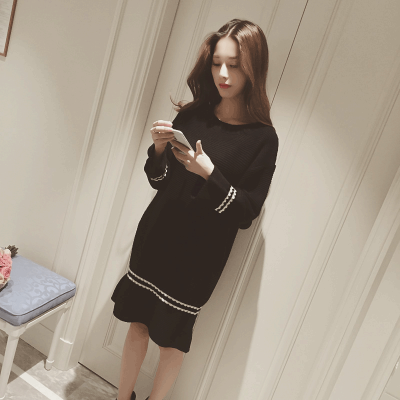 新款韓版打底毛衣裙中長款圓領(lǐng)拼色荷葉邊連衣裙套頭針織衫外套女 /