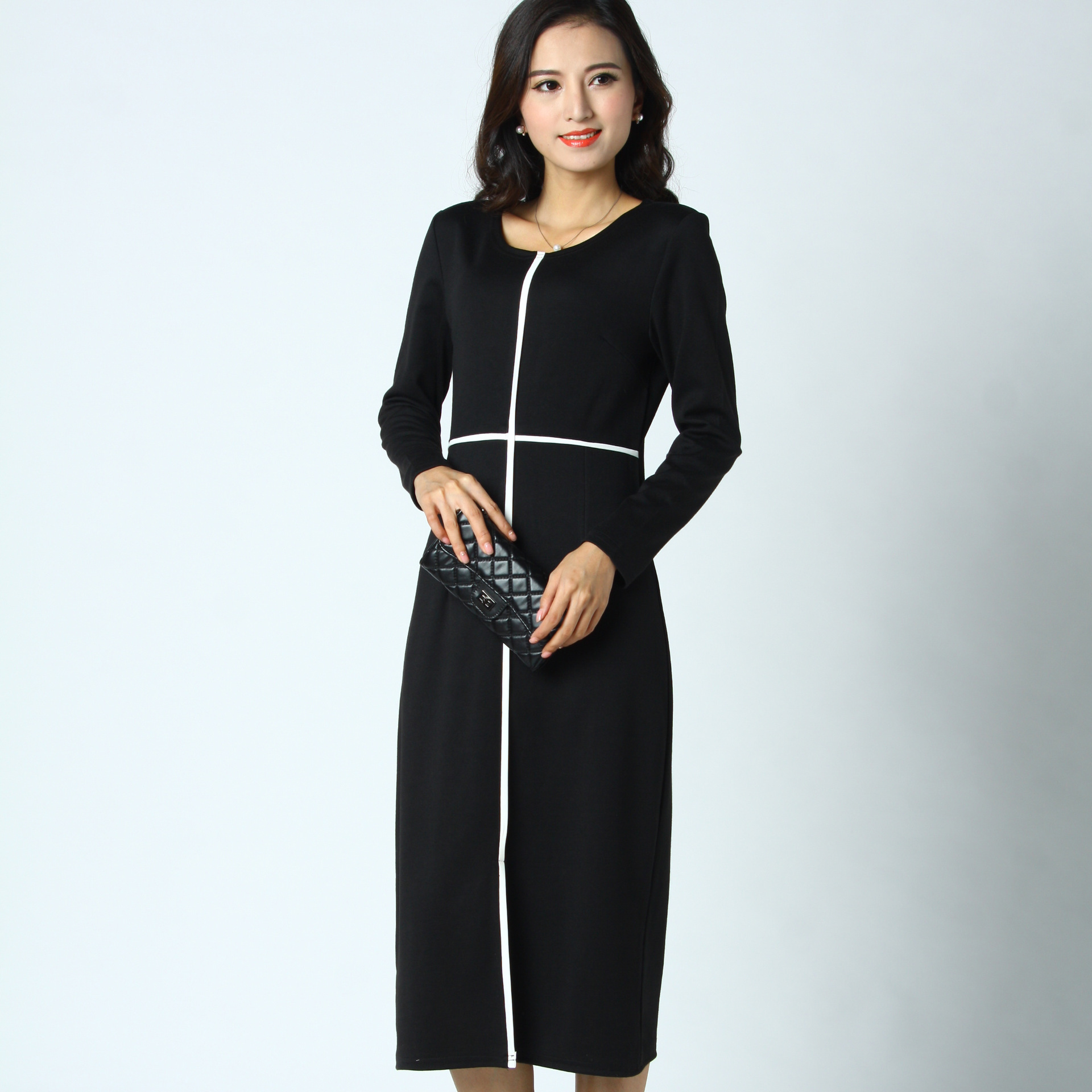 歐美2015秋冬新款修身大牌中長款圓領女裝包臀打底裙長袖連衣裙 /