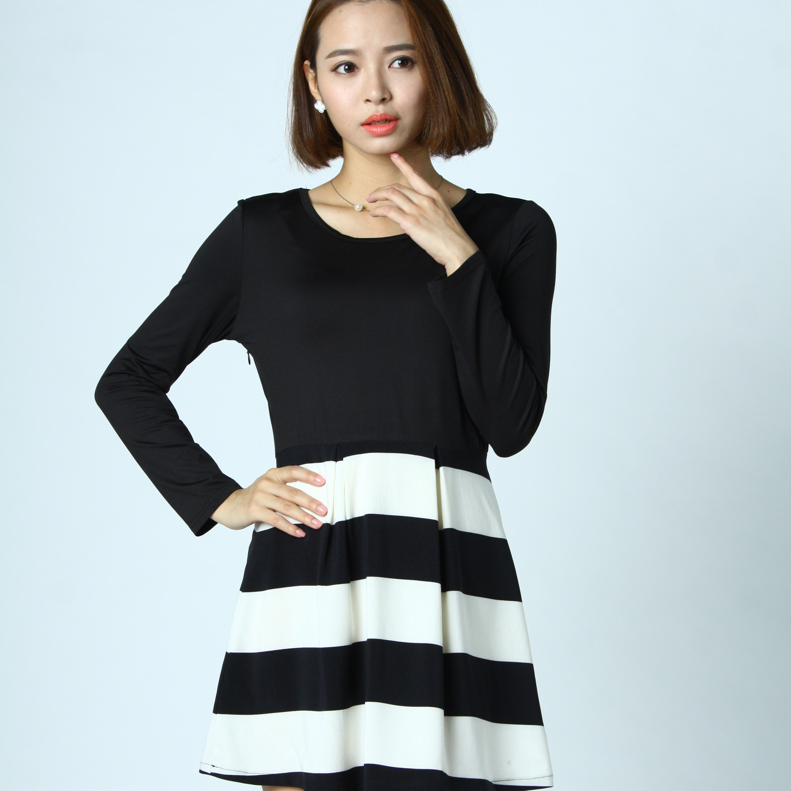 2016春假兩件套修身顯瘦長袖條紋拼接打底針織連衣裙中長款 /