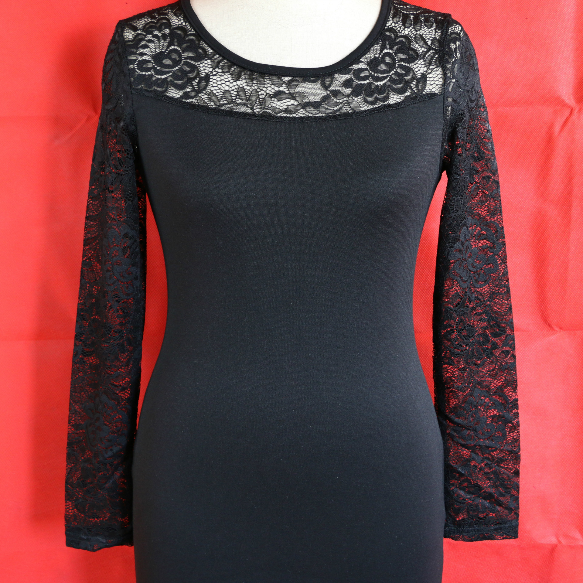 2015新款韓版女裝中長款黑色長袖蕾絲時尚性感裹胸連衣裙廠家批發(fā) /