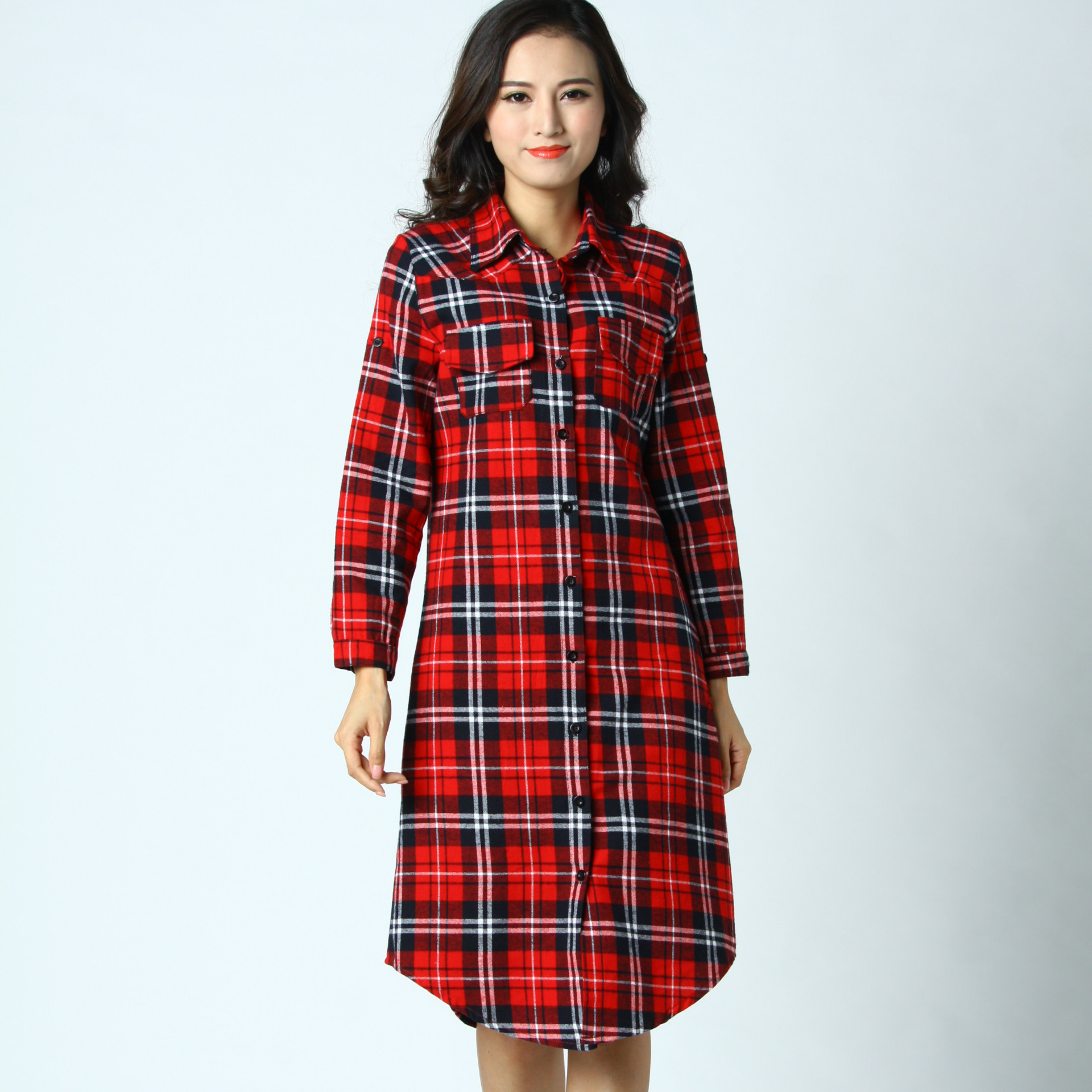 歐洲站2015秋冬新款歐美女裝立領紅格子a字裙爆款長袖修身連衣裙 /