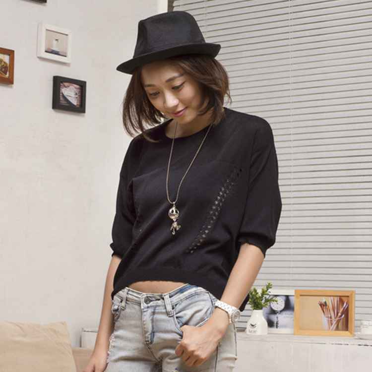 秋冬新款女式針織衫 中袖破洞羊毛衫韓版羊毛衫女裝套頭短款毛衣 /