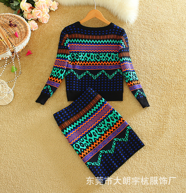 2015歐洲站秋冬新款女裝修身時(shí)尚針織短裙 兩件套印花包臀裙套裝 /