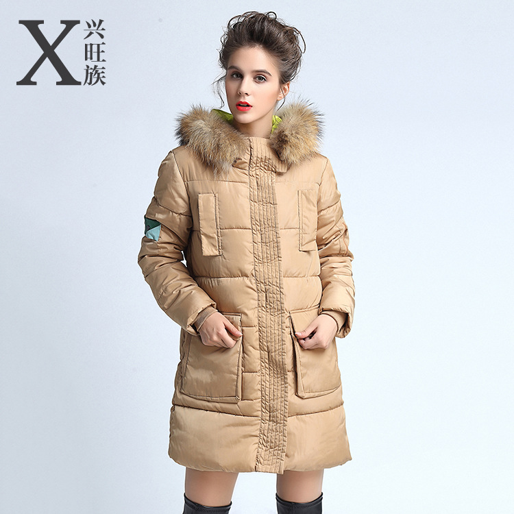 冬季修身保暖加厚棉衣女中長款2015新款 時(shí)尚連帽大毛領(lǐng)羽絨棉服 /