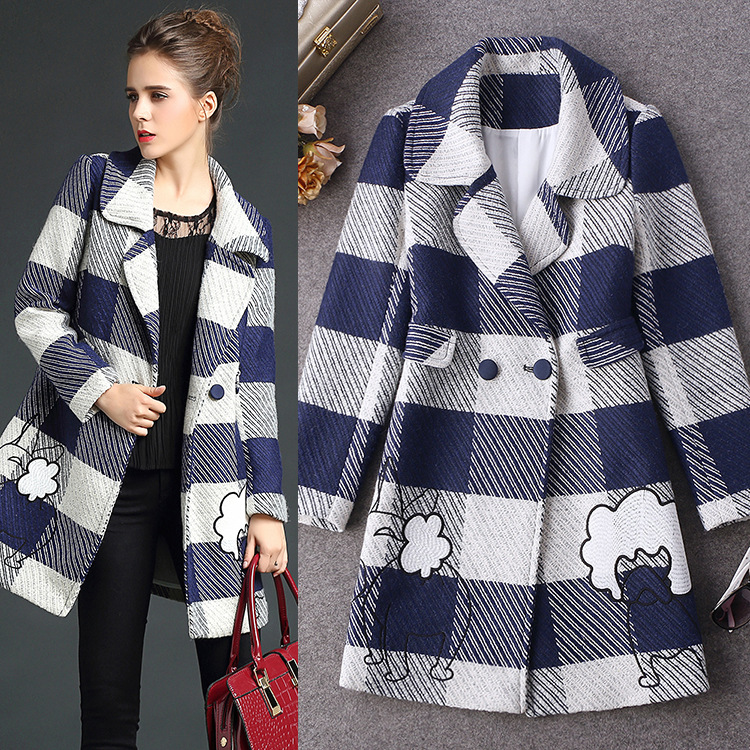歐美中長款格子羊毛呢大衣女秋冬裝2015新款 綿羊刺繡羊毛外套 /