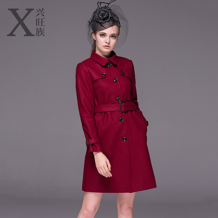 歐美高端女裝2015秋冬長袖修身外套單排扣紅色羊毛呢大衣女中長款 /