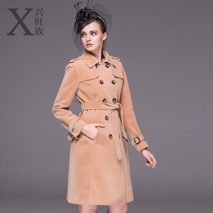 秋冬新款歐美高端駝色長款羊絨大衣女款 修身雙排扣羊毛外套大衣 /