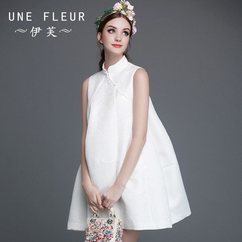 伊芙2015秋季新款歐美女裝短裙無袖女提花盤扣立領(lǐng)寬松A字連衣裙 /