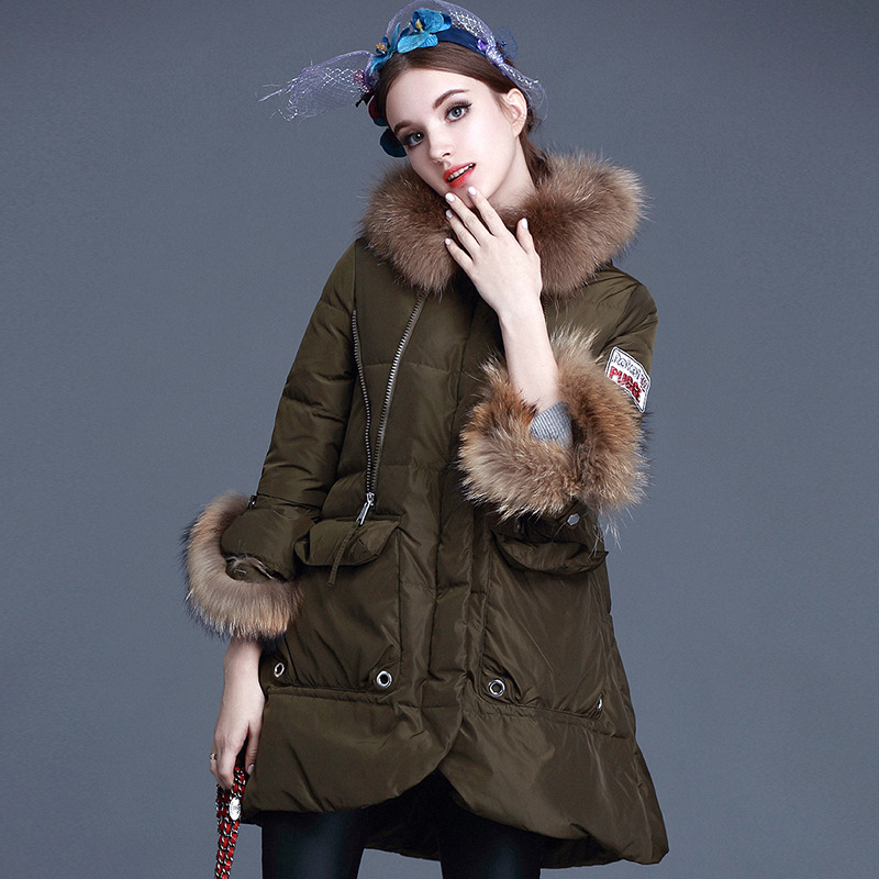 歐美2015秋冬新款女連帽超大毛領(lǐng)毛毛袖口寬松A廓型羽絨服外套 /