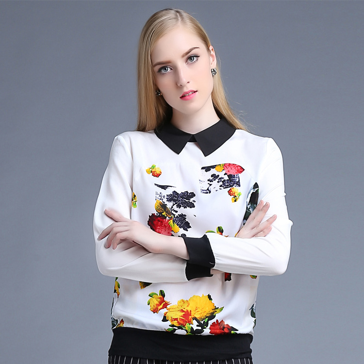 2015秋冬裝新款真絲襯衫 歐洲站品牌印花長袖打底T恤衫襯衣批發(fā) /