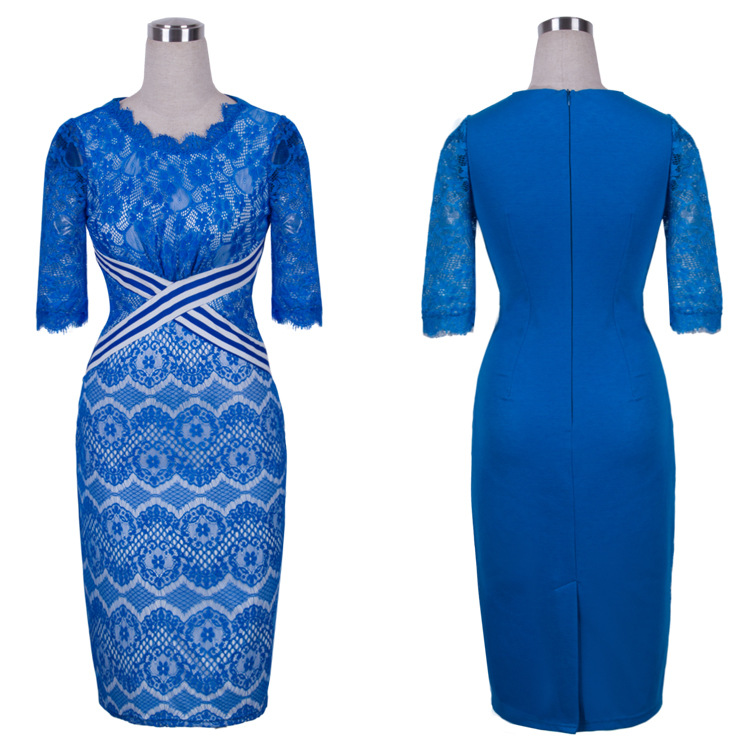 Ebay速賣通 歐美秋冬新款 時尚氣質(zhì)藍(lán)色蕾絲包臀裙 晚禮服 /