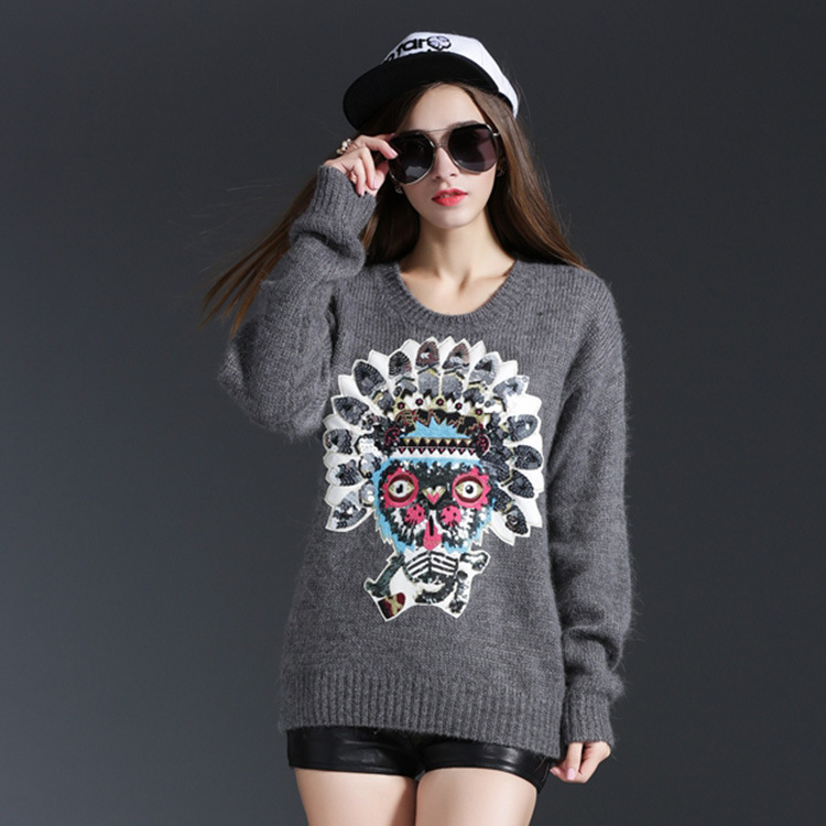 毛衣女2015秋冬新款 時尚圓領(lǐng)寬松女式繡花長袖套頭毛衣 代理批發(fā) /
