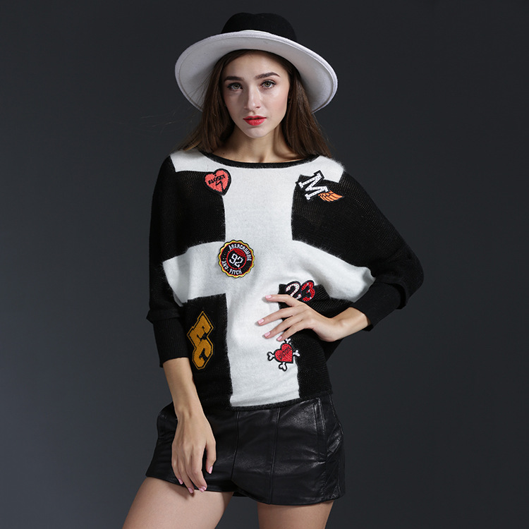 毛衣女2015秋冬新款 羊毛衫女套頭大圓領(lǐng)貼章長袖寬松毛衣女批發(fā) /