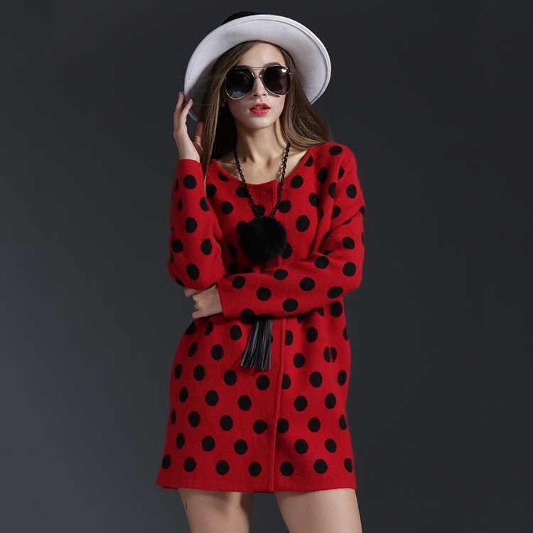 2015秋冬新款毛呢大衣中長款 時尚波點圓領(lǐng)長袖女式風衣批發(fā)代理 /