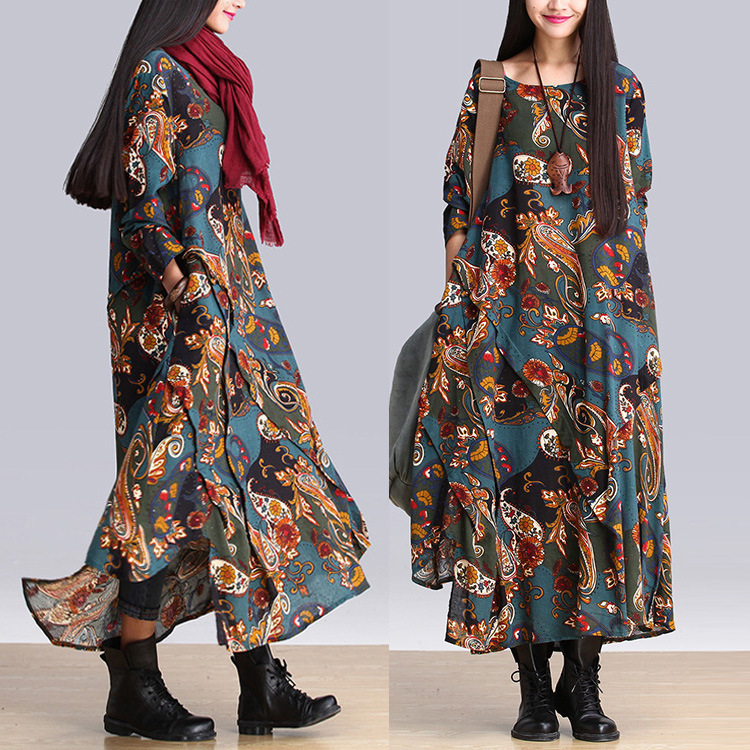 民族風(fēng)印花長(zhǎng)袖棉麻連衣裙袍子 文藝范2015夏胖MM大碼女裝 /
