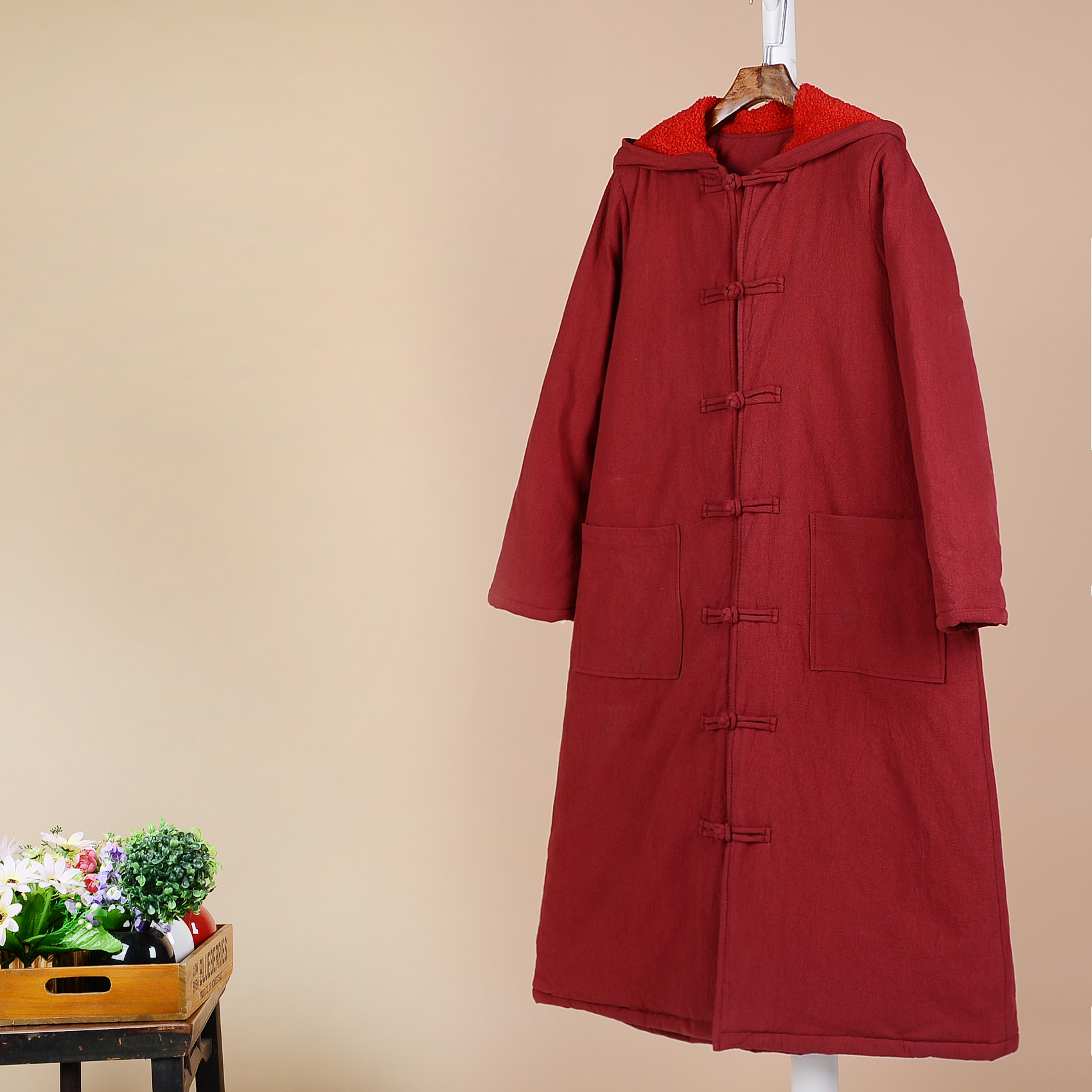 微笑向暖原創(chuàng)復(fù)古連帽加長(zhǎng)款棉衣冬裝外套盤扣大棉衣 /