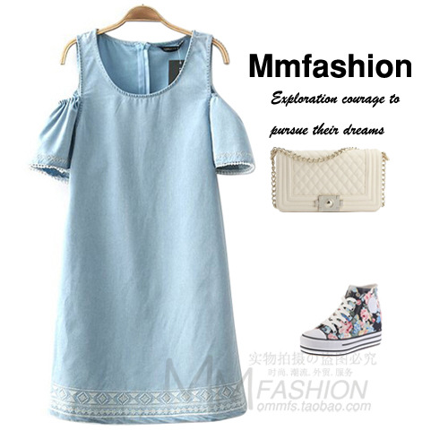 尾單外貿(mào)正品原單剪標(biāo)女裝日系小清新刺繡露肩天絲牛仔連衣裙夏裝 /