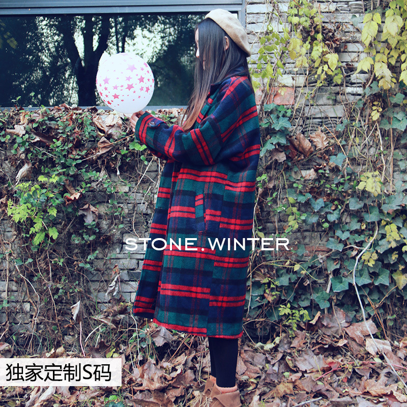 2015秋冬加長(zhǎng)款復(fù)古寬松格子女大碼毛呢加棉外套加厚大衣 /