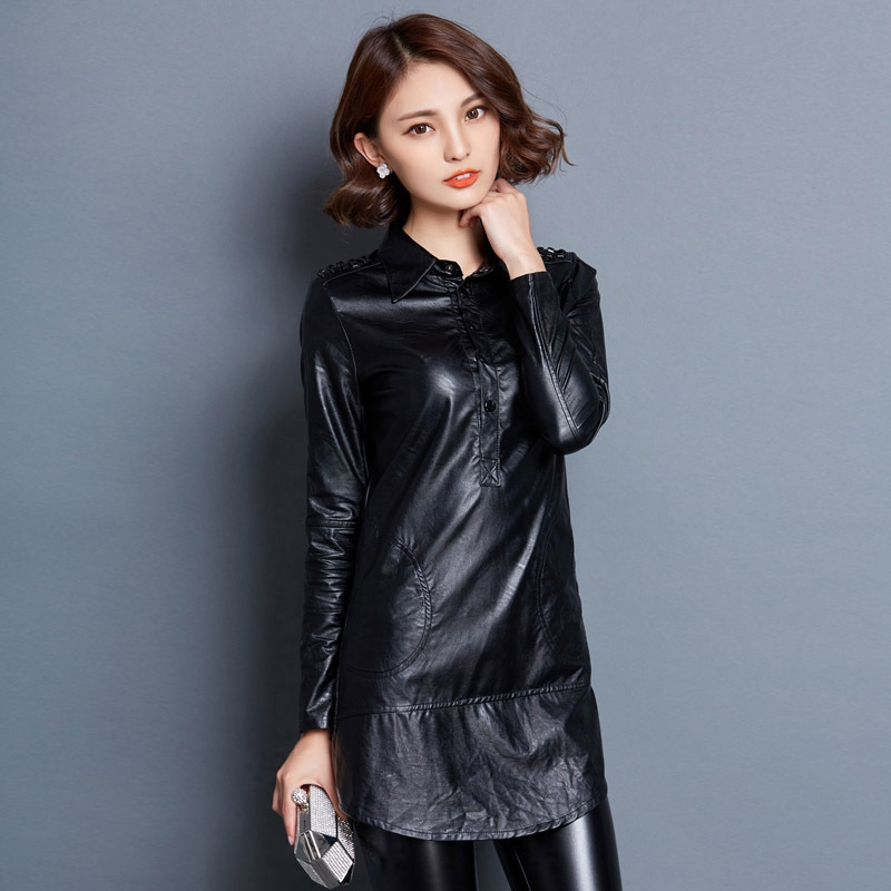 歐美大牌2015秋冬新款韓版翻領(lǐng)修身顯瘦PU皮衣女長袖中長款打底衫 /