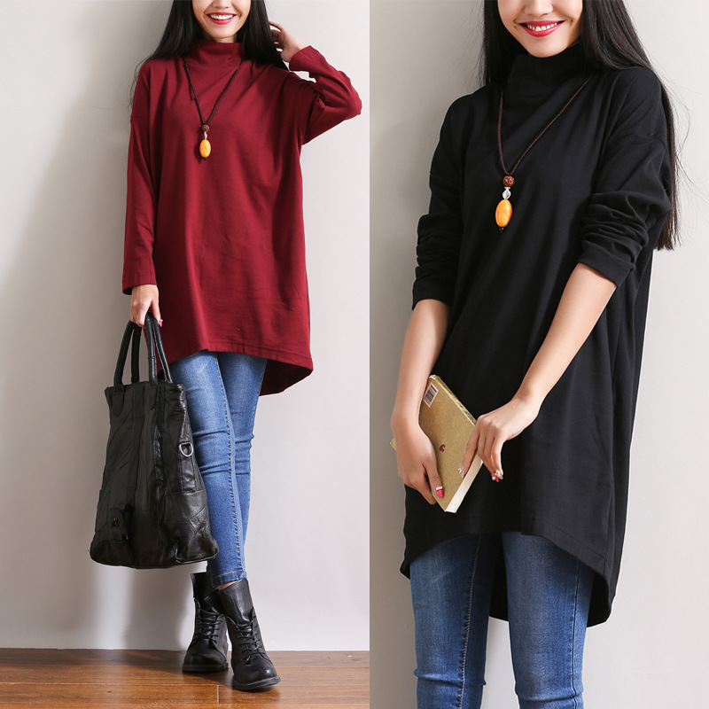 實(shí)拍 2015秋冬新款 加厚保暖純色寬松中長款套頭打底衫棉T恤 /