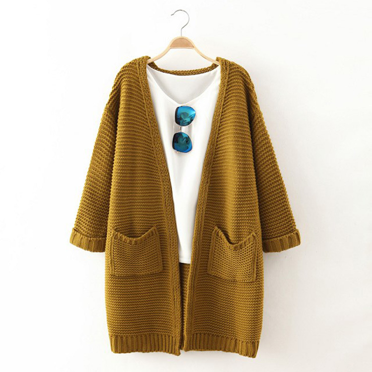 韓版2015秋冬新款中長款針織女裝純色雙口袋寬松百搭針織開衫外套 /