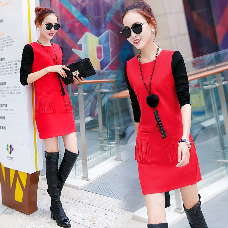 女裝 2015長袖連衣裙女裝2015秋冬裝韓版新款流蘇修身加厚毛 /