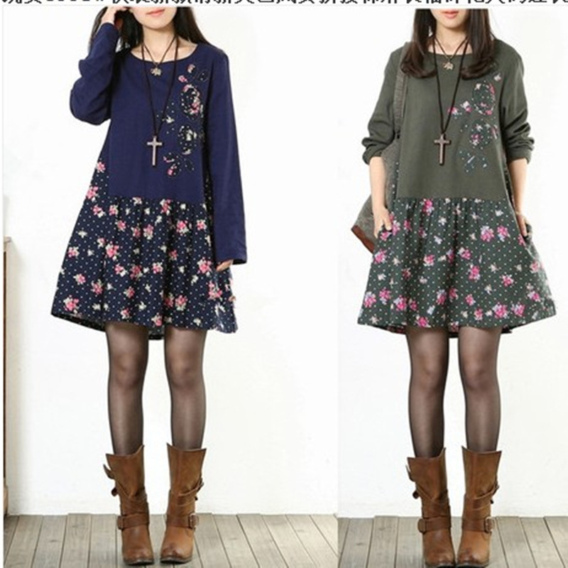 2016春秋裝新款清新文藝風(fēng)女拼接棉麻長袖碎花大碼連衣裙 /