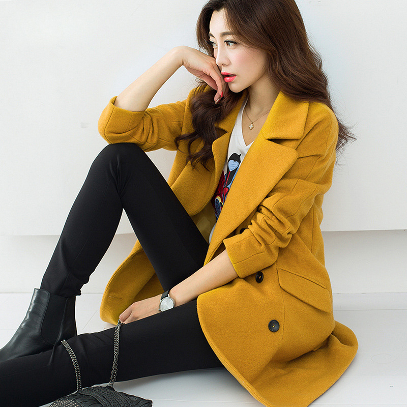 2015冬裝新款繭型橘色加厚呢子大衣韓版中長款修身毛呢大衣外套女 /