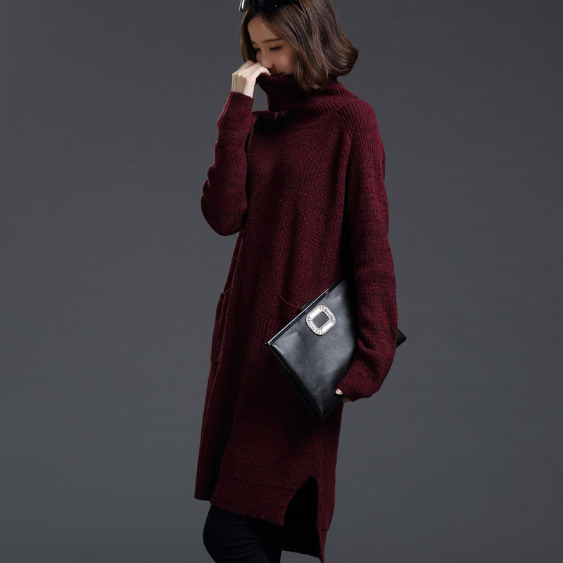 歐美秋裝新品時尚高領(lǐng)修身長袖開叉加長款口袋毛衣針織連衣裙批發(fā) /