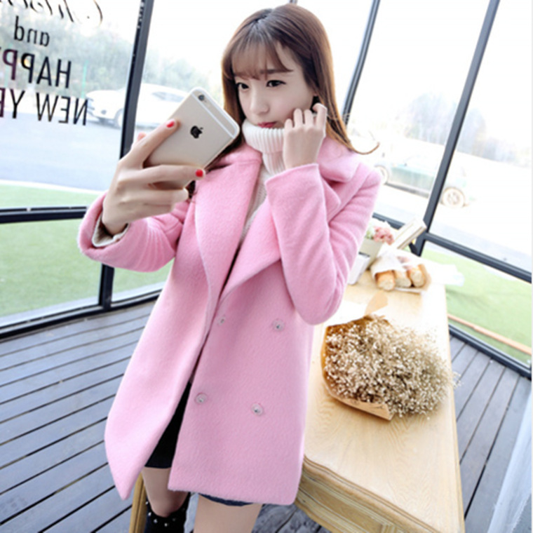 毛呢外套女2015秋冬新款韓版中長款呢子繭型粉色毛呢大衣潮 /