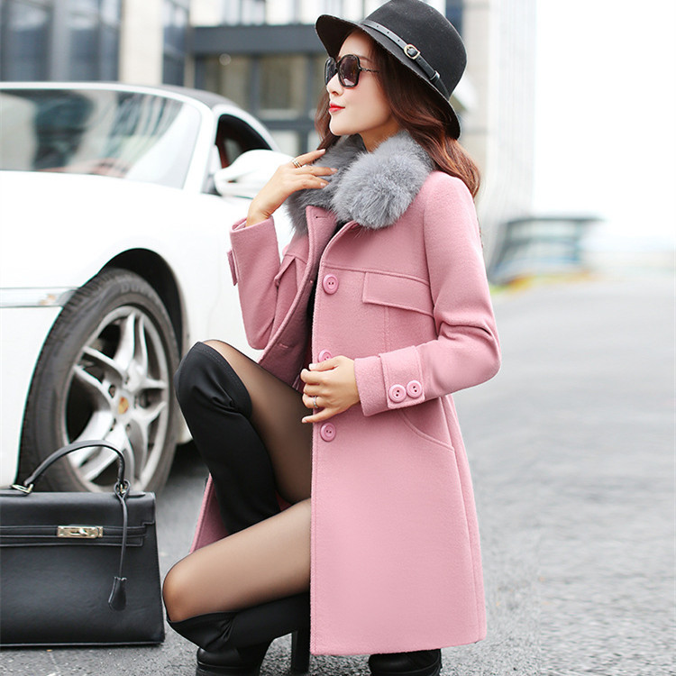 秋冬新款狐貍毛領(lǐng)韓版毛呢純色女裝修身中長款外套風(fēng)衣 /