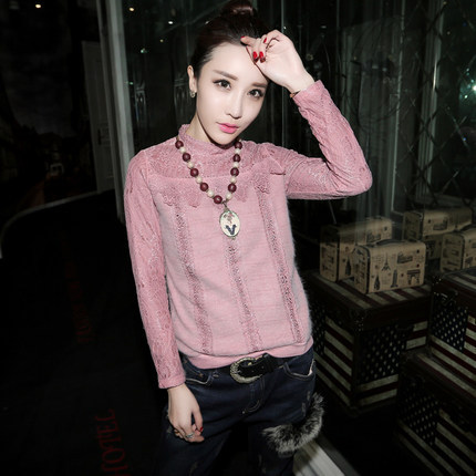 2015歐洲站秋冬新款蕾絲打底衫半高領粉色t恤加絨加厚女長袖 /