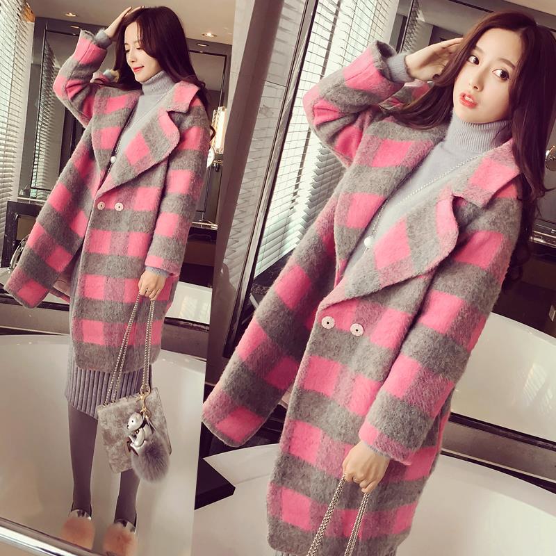 2015冬裝新款韓范撞色粉色格子顯瘦中長款毛呢大衣 /
