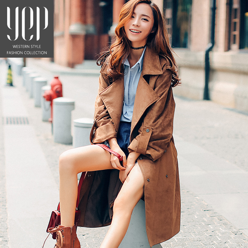 YEP2015冬裝新品歐美寬松大碼廓形長(zhǎng)款麂皮絨風(fēng)衣長(zhǎng)袖大衣外套女 /