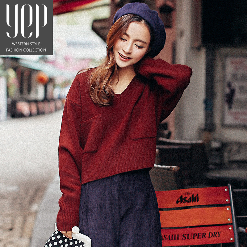 YEP2015冬裝新品韓版酒紅色口袋套頭針織衫V領(lǐng)毛衣女式打底短款 /