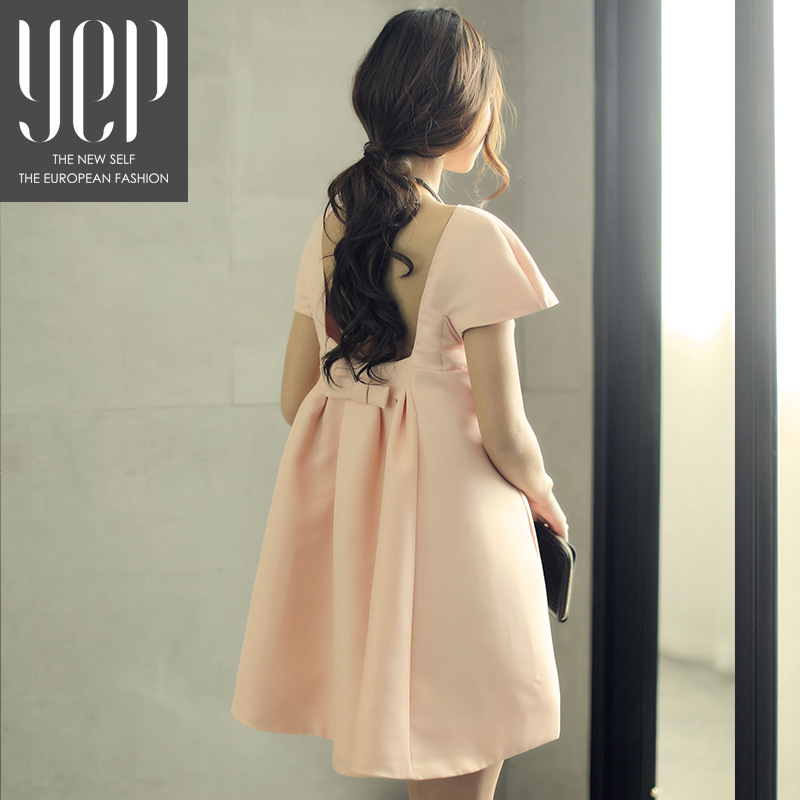 2015年夏裝新款甜美短袖大碼露背蝴蝶結(jié)高腰連衣裙 蓬蓬裙 /