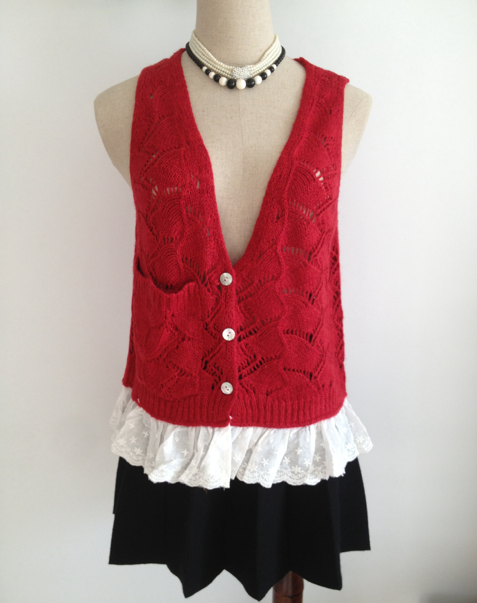 2015外貿(mào)新款日韓甜美大朗毛衫女式針織鏤空勾花蕾絲底邊開衫背心 /