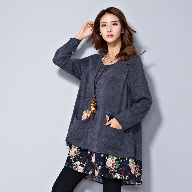 2015新款胖MM韓版大碼假兩件中長款長袖棉麻連衣裙毛衣 /