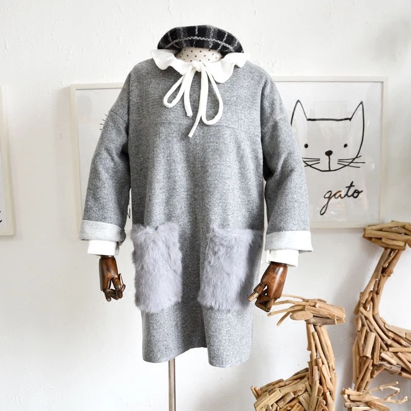 立蓉2015秋冬韓國東大門代購新款尼毛拼接兔毛口袋荷花領連衣裙 /