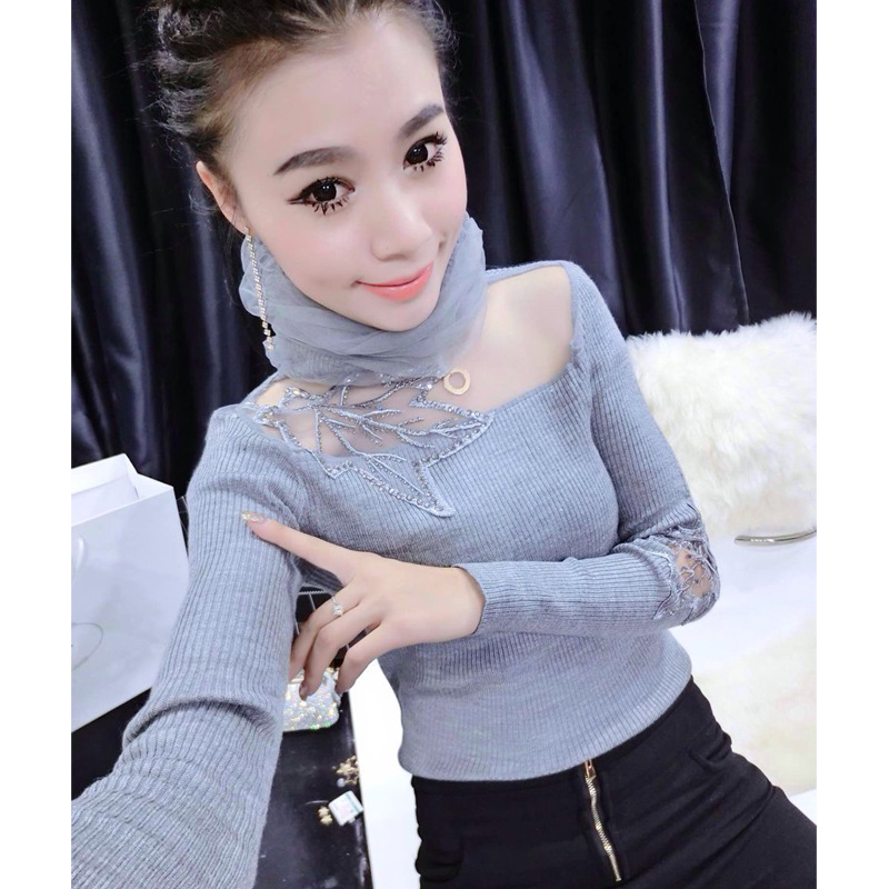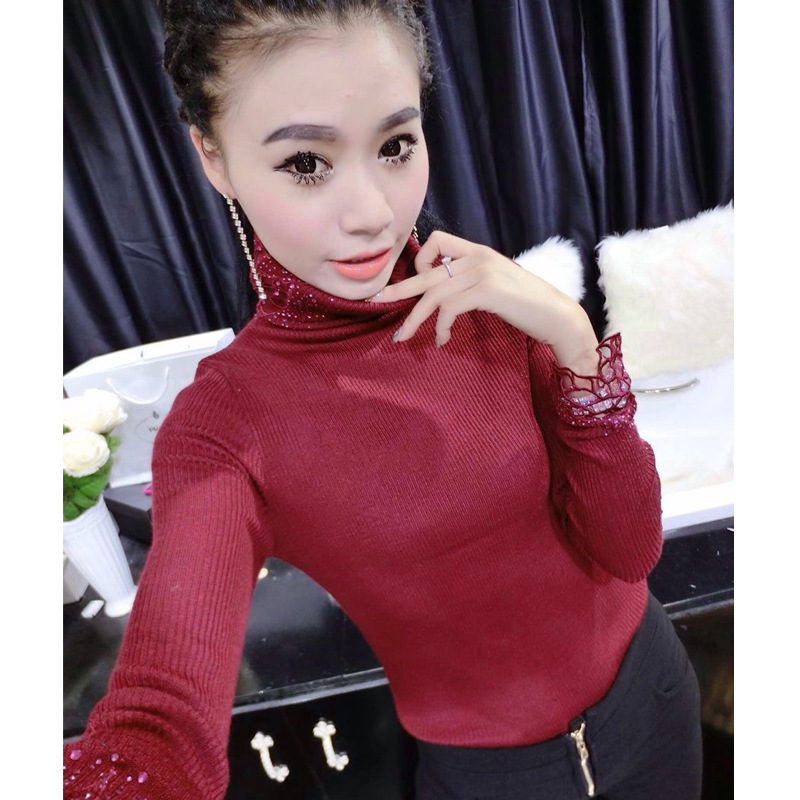 2015秋冬新款韓版女裝毛衣蕾絲高領拼貼鉆修身毛織針織打底衫批發(fā) /