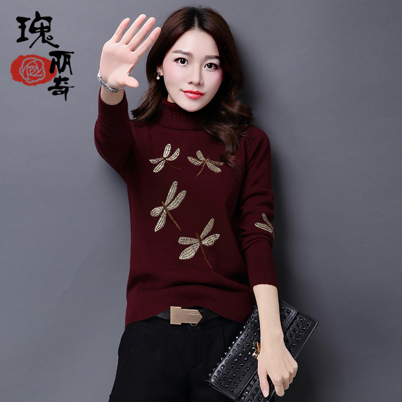 2015秋冬新款韓版高領(lǐng)套頭寬松打底針織衫蜻蜓繡花圖案毛衣女 /