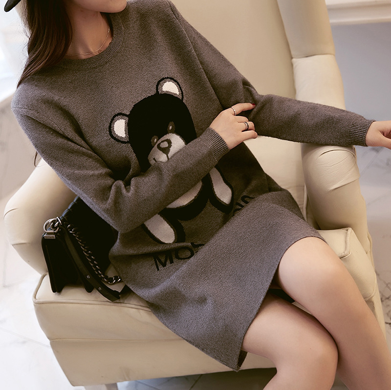 2015韓版秋冬新款女士針織衫 套頭中長款毛衣小熊圖案針織衫 打底 /