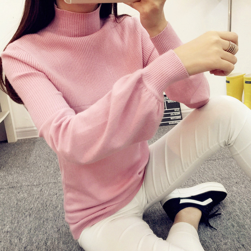 高領(lǐng)修身打底針織衫套頭毛衣泡泡袖打底衫 /