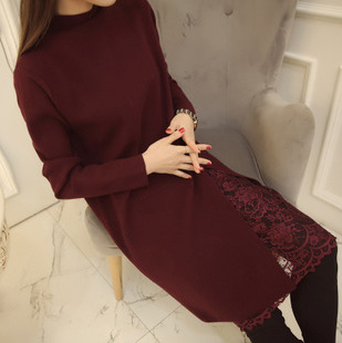 2015新款韓版長(zhǎng)款毛衣連衣裙半高領(lǐng)套頭下開(kāi)叉蕾絲下擺女款 /