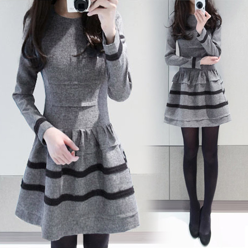 2015 秋冬新款韓版 修身顯瘦大碼圓領(lǐng)加厚裙子長袖大擺女連衣裙 /