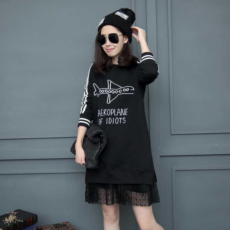 歐洲站2015秋冬飛機(jī)圖案刺繡衛(wèi)衣拼接蕾絲中長款連衣裙T恤 /