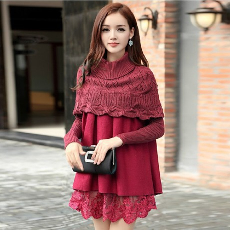 真兩件高領(lǐng)披肩打底蕾絲鏤空斗篷公主連衣裙針織拼接蓬蓬裙 /