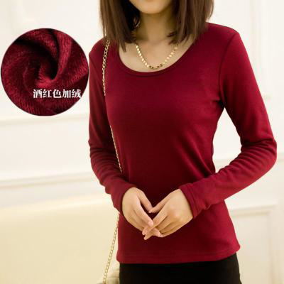 R修身加絨打底衫韓版顯瘦加厚保暖不倒絨t恤女純色性感圓領(lǐng)衫 /