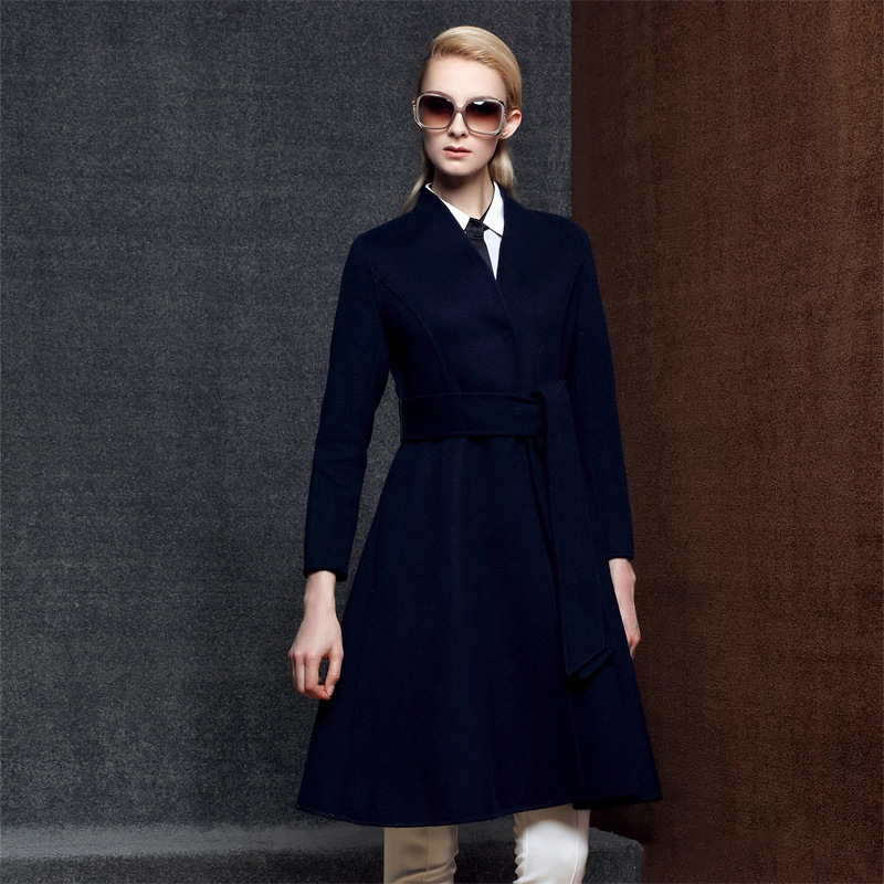 歐乙緣2015歐美特價新款連帽系帶長袖修身長款冬季雙面羊絨大衣女 /