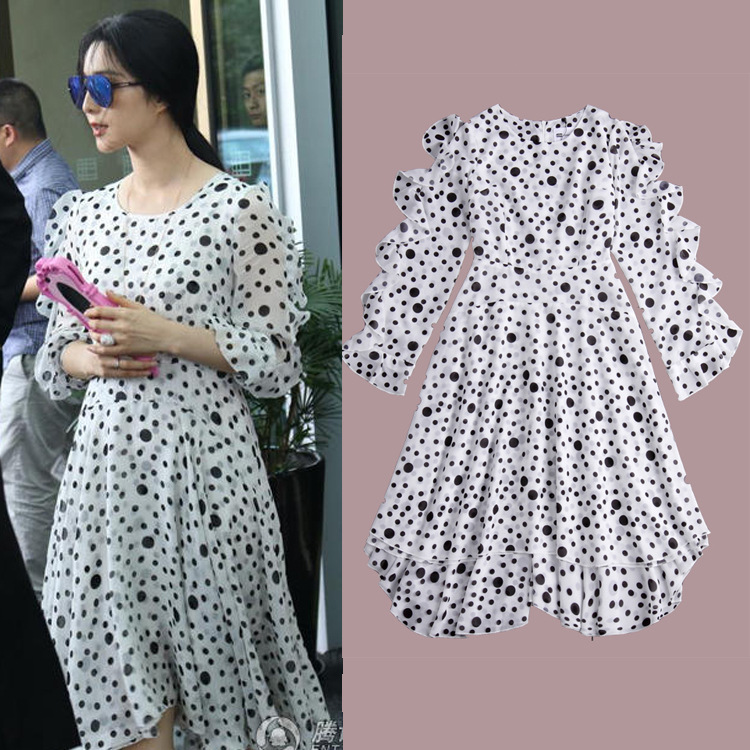 2015夏裝新款范冰冰同款修身顯瘦波點圓點不規(guī)則裙擺雪紡連衣裙 /